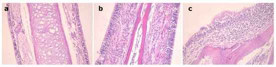 Nasal mucosal tissue of: (a): control mouse, (b): mouse received EH solution, (c): mouse received EH mucoadhesive emulsomes.