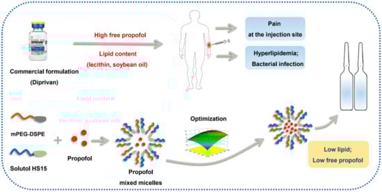 In order to replace the high level of lipid component and reduce the concentration of free propofol, this study presents a novel micelles formulation based on DSPE mPEG2k and Solutol HS 15. DSPE mPEG2k has emerged as an excellent drug carrier for therapeutics since the initial discovery of its ability to form polymeric micelles in aqueous environments in 1994 [23]. Solutol HS 15 is a potent non-ionic solubilizing agent with low toxicity and a strong solubilization effect [24]. Its relatively bulky hydrophobic compartment possibly facilitates better drug solubilization. The tailored composition of the hydrophobic block can achieve stable encapsulation of lipophilic molecules. A DSPE mPEG2k/Solutol HS 15 mixed micellar structure not only reduces the concentration of free propofol in the aqueous phase, but it also provides a new formulation of propofol with higher safety and efficacy attributes (Figure 1). This study evaluates the new formulation of the propofol-mixed micelle for size distribution, zeta potential, pH, osmolarity, morphology, and the degree of free propofol in the aqueous phase. Moreover, in vivo efficacy and pharmacokinetic studies were conducted in rats.