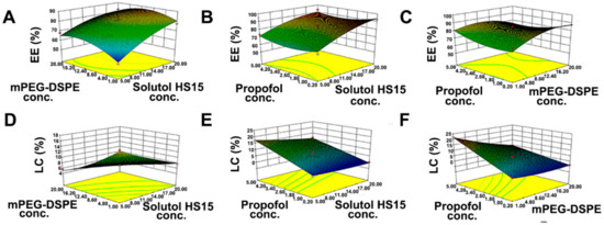 The 3D response surface plots diagrams of EE (A–C) and LC (D–F). X1, X2, and X3 represent the concentration of Solutol HS 15, DSPE mPEG2k, and propofol, respectively.