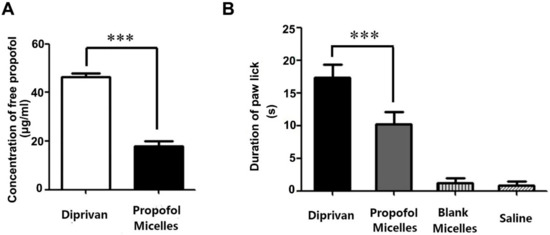 (A) Free propofol concentration in the aqueous phase of the mixed micelles and Diprivan (mean ± SD, n = 6). (B) Duration of rat paw-lick for propofol-mixed micelles and Diprivan (n = 6; *** p < 0.001).
