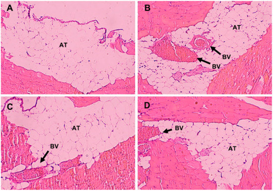 Representative HE-staining micrographs of peritoneal tissues in mice after intraperitoneal administration. Injection with saline (A), acetic acid (B), Diprivan (C), and propofol micelles (D). Arrows in the panels indicate AT = adipose tissue and BV = blood vessel.