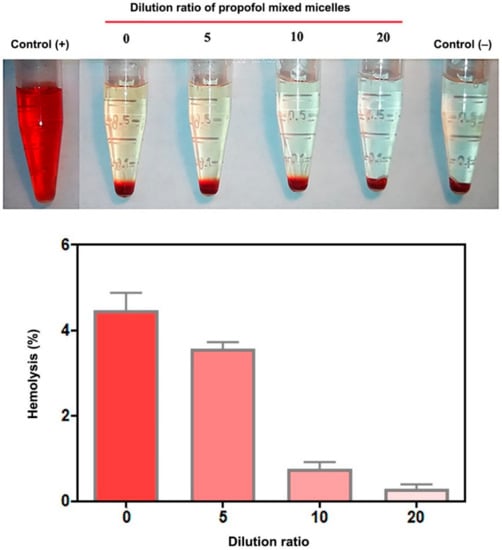 It was reported that lipid emulsion Diprivan made with lecithin exhibited potential hemolytic activity, probably associated with the presence of lysophosphatidylcholine and phosphatidyl ethanolamine, which were produced by the hydrolysis of lecithin during preparation and storage of the formations [31]. Thus, to assess the blood compatibility, a hemolysis test of propofol-mixed micelles at different dilution ratios was conducted to confirm the biocompatibility. Figure 6 shows that the hemolysis rate of propofol-mixed micelles was lesser than 5%, indicating the micelles had a non-hemolytic reaction.