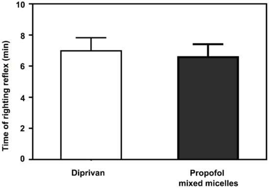 Male SD rats were injected intravenously with the propofol-mixed micelles or Diprivan at a dose of propofol 10 mg/kg to evaluate recovery from anesthesia. The end of the injection was assigned as time zero. The rats were placed in supine positions, and the loss and recovery time of the righting reflex was monitored.