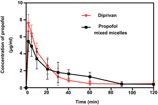The average plasma concentration versus time profiles of the propofol-mixed micelles and Diprivan are displayed in Figure 8. The pharmacokinetic parameters were calculated by two-compartment modeling (Table 6). Initial plasma concentration of the propofol for the mixed micelles showed a slight decrease. The distribution half-life (t1/2α) of micelles was 6 min, which was approximately 40% shorter than that for Diprivan (10 min). Furthermore, the mixed micelles showed a shorter elimination half-life (t1/2β) than that of Diprivan. It might be due to the micellar-controlled release property and the drug needs more time to release from the system. In addition, similar results were observed in the apparent volume of CL and AUC(0–120 min) between the propofol-mixed micelles and Diprivan, which means that the two formulations have similar absorption and clearance effects after a single dose. Table 6 shows that propofol was absorbed rapidly and eliminated quickly.