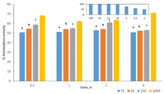 Antioxidant activity (%) of different concentrations of the algal extracts (25, 50, 250, and 1000 μg/mL) obtained after various extraction times, shown in different colors. All experiments were done in triplicate, and values are expressed as mean values ± SD. Groups with the same letters are insignificantly different at p = 0.05. The inserted figure shows the % antioxidant activity of different concentrations of ascorbic acid as a reference.