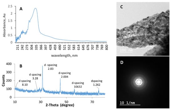 Figure 2A shows the UV-visible spectrum of the synthesized CuO NPs, where the peak appearing at around 290–330 nm confirms the formation of the nanoparticles. This spectrum showed significant similarity to those attributed to previously synthesized copper nanoparticles from brown algae []. The wavelength range is also in good agreement with the 290–320 nm range previously reported for biosynthesized copper nanoparticles and the 250–350 nm range for CuO NPs [].