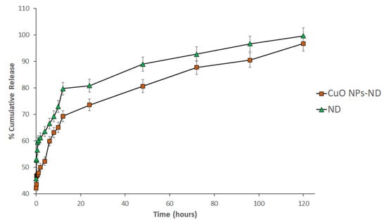 The release profile of 0.09 mM ND loaded onto the synthesized CuO NPs over 120 h is presented in Figure 3. The profile shows the sustained release of ND from the formulation reaching its maximum release at 120 h. This data is in agreement with previous reports of the sustained release of doxorubicin encapsulated in naturally synthesized fucoidan nanoparticles extracted from brown algae over 5 days [,].
