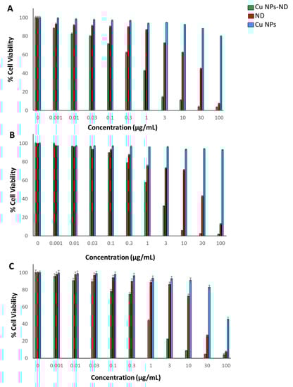 The cell viability of hepatocellular carcinoma (HEP-G2), breast adenocarcinoma (MCF-7) and ovarian cancer (SKOV-3) cell lines treated with different concentrations (ranging from 0.001 to 100 µg/mL) of ND, CuO NPs, and the CuO NPs-ND formulation were tested using the sulforhodamine B (SRB) test assay. Some recent reports suggest that the ethanol or ethyl acetate extracts of several algal species display observable cytotoxic activities on several cancer cells [,,]; however, to the best of our knowledge, there are no reports on drugs loaded onto CuO NPs synthesized from algal extracts.