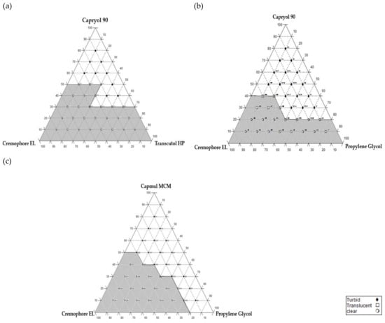 Pseudo-ternary phase diagrams for (a) system I (Capryol/Cremophor EL/Transcutol HP), (b) system II (Capryol/Cremophor EL/Propylene glycol) and (c) system III (Capmul MCM/Cremophor EL/Propylene glycol).