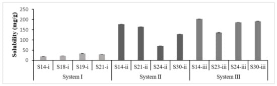 PGZ solubility in L-SNEDDS reflects the drug loading capacity. In that, a remarkable variability was observed owing to the formulation composition, specifically the type of and the amount of cosurfactant added rather than the type of oil (Figure 2). S14-i (system I) showed the least PGZ solubility of 18.47 mg/g with 60% Transcutol, while S14-iii (system III) showed the highest PGZ solubility of 202.56 mg/g with 60% Propylene glycol.