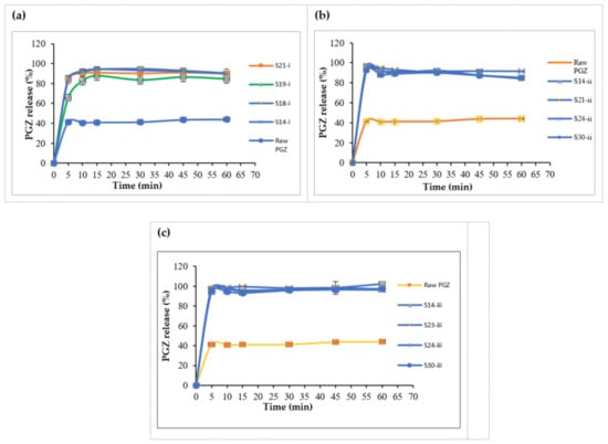 Raw PGZ showed poor dissolution with 44% maximum release within 60 min run time, while all prepared liquid SNEDDS formulations had shown similar immediate release patterns of >80% after 10 min (Figure 7a–c). Accordingly, the release of the drug was significantly enhanced by optimized L-SNEDDS (p < 0.05). S14-iii formulation achieved 100% release after 60 min, as the behavior of the dissolution profile is directly proportional to the droplet size, and also to the solubility of the drug in the formulation, S14-iii showed nanosized droplets with the highest solubilizing capacity that would increase the drug absorption and thus bioavailability [].