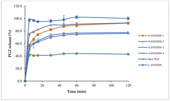 Self-nanoemulsifying formulations should be liquid monophasic systems of an oil-surfactant-cosurfactant mixture to present the drug in its solubilized form []. Therefore, the solubility is an important criterion to achieve high drug loading and prevent drug precipitation when introduced to GIT fluids [,]. PGZ structure (log p = 2.3) favors solubilization in small or medium molecular structures of fatty acids and/or mono- or diglycerides with their high ester content [], amphiphilic surfactants and cosurfactants, rather than lipophilic structures and long-chain glycerides (Table 1).