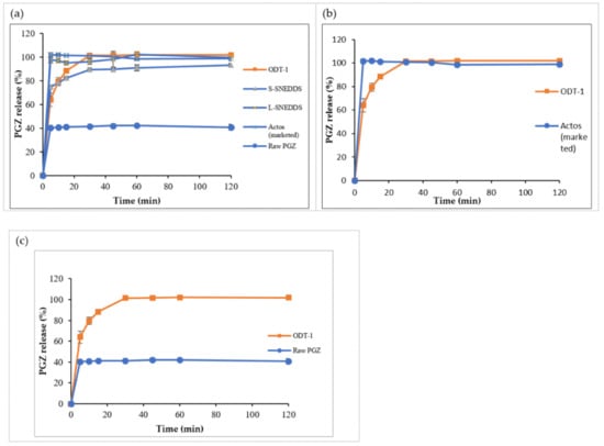 ODT tablets showed a significant higher release than the solidified S-SNEDDS formulation (p < 0.05) (Figure 9a). In addition, the ODT release pattern did not differ significantly from the release of the marketed tablet (Figure 9b) (p > 0.05). However, the ODT tablet obtained a release of 88% of PGZ after 15 min and reached 100% after 30 min, which proved the solubility enhancement of PGZ by self-nanoemulsifying properties by a 2.5-fold increase in the release of raw PGZ (p < 0.05) (Figure 9c).