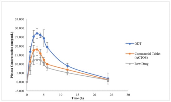 In vivo data revealed a significant improvement in PGZ pharmacokinetic profile in terms of Cmax and AUC values for ODT formulation as compared to the raw drug suspension (p < 0.05). Moreover, the pharmacokinetic parameters obtained in the prepared ODT tablet were compared to the relevant commercially available film coated tablet (Actos®) and it was found that the prepared ODT formulation attained significant superior bioavailability (p < 0.05). Similarly, the correlated pharmacodynamic data showed a significant decrease in blood glucose levels with ODT formulation as compared to the commercially available tablet and raw drug suspension (p < 0.05). However, stability studies for ODT formulation showed no drug degradation or change in tablet characteristics.