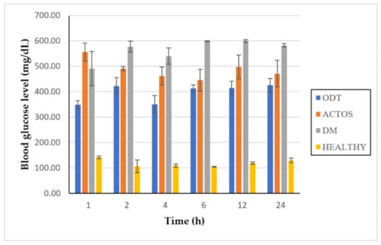 Graphical representation of the blood glucose levels in the 4 groups of rats (ODT, ACTOS® (Commercial tablet), DM and Healthy) at time intervals of 1, 2, 4, 6, 12 and 24 h. Abbreviations: ODT, oral disintegrating tablet; DM, diabetic rats.