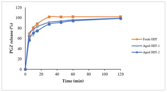 In vitro dissolution profile of Pioglitazone HCl from aged ODT tablets at accelerated storage condition; Aged ODT-1 at 25 ± 2 °C, 60 ± 5%; Aged ODT-2 at 40 ± 2 °C, 75 ± 5%. Abbreviations: ODT, orally disintegrating tablet; PGZ, Pioglitazone Hydrochloride.