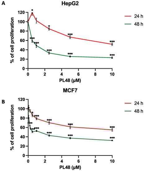 Effects of PL48 inhibitor on (A) HepG2 and (B) MCF7 cell proliferation. Cells growing in the log phase were incubated with MEM (HepG2) or RPMI-1640 (MCF7) in the presence or absence of PL48 at concentrations of up to 10 μM for 24 or 48 h. Cell number was determined by crystal violet staining and expressed as a percentage of the control cells. These experiments were performed twice in triplicate. * p < 0.05, *** p < 0.0001.