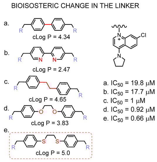 Effect of the linker bioisosteric change in the inhibitory activity towards the ChoKα1. The IC50 values of compounds (a–d) are taken from [21,41,42], (e) corresponds to PL48.