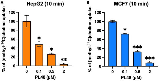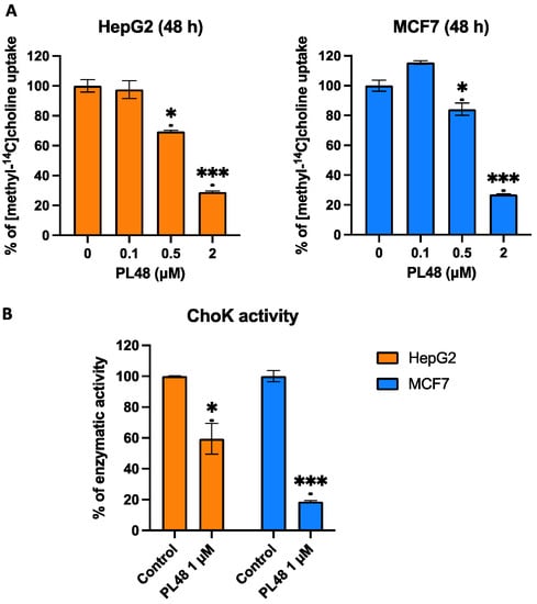 Effects of PL48 on choline uptake in HepG2 (A) and MCF7 (B) cancer cell lines. Choline uptake was assayed in cells treated for 10 min with increasing concentrations of inhibitor. Data represent the mean ± SEM of two independent experiments conducted in triplicate. Results are normalised to their respective controls. * p < 0.05, ** p < 0.001, *** p < 0.0001.