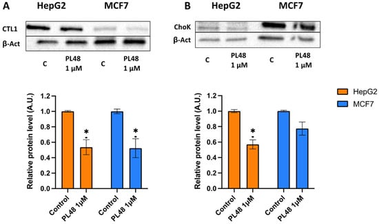 Effect of PL48 on CTL1 and ChoK protein levels in HepG2 and MCF7 cells. Cells were incubated without PL48 (control) or with 1 μM PL48 for 48 h. (A) Western blots show representative results of experiments repeated three times. (B) Protein levels in the samples were normalised to their respective β-actin levels and expressed as x-fold change compared with the corresponding control ratio (1.0). Data represent the mean ± SEM of three independent experiments. * p < 0.05.