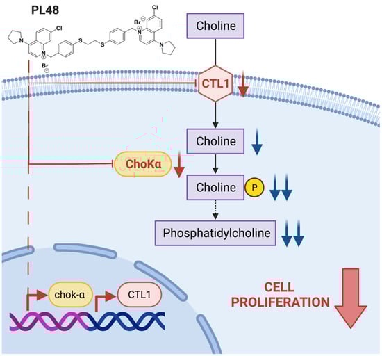 The results obtained in this work indicate that PL48 inhibits not only Chokα1 activity and expression but also the uptake of choline through the CTL1 transporter (Figure 10). Both ChoKα1 and CTL1 proteins are promising therapeutic targets to inhibit cell proliferation in MCF7 and HepG2 cell lines. Our data show that PL48 is a good candidate for further preclinical evaluation as a potential anticancer drug.