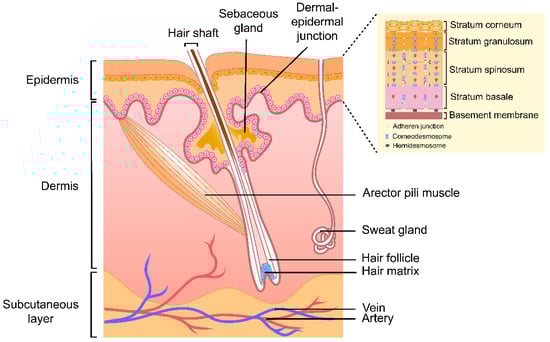 The upper layer of the skin is a highly stratified layer known as the epidermis. The epidermis is composed of five layers from the outermost to the bottom: the SC, stratum lucidum, stratum granulosum (granular layer), stratum spinosum (spinous layer) and stratum basale (basal layer) [20]. The last four layers constitute the viable epidermis [21]. The major cellular components of the epidermis layer, keratinocytes, gradually differentiate and migrate outwards from the stratum basale to the SC [20]. Upon complete maturation, keratinocytes are transformed into corneocytes. Underneath the epidermis layer is the dermis layer, which is composed of connective tissue where the skin appendages originate; these are the hair follicles, sebaceous glands, and sweat glands [1,6,11,12]. The epidermis and dermis layers are connected and mechanically supported by the dermal–epidermal junction (basement membrane).