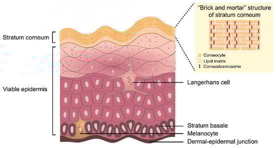 The epidermis is composed of the SC and the viable epidermis (Figure 2). As described earlier, the main role of the SC is to provide a physical barrier. The SC has been reported to contain approximately 15% water, 15% lipids, and 70% proteins [22]. The structure of the SC resembles a ‘brick and mortar’ wall, in which the corneocytes as the ‘bricks’ are interconnected by the ‘mortar’ of a lipid matrix [23]. The lipid matrix, also described as intercellular lipids, is a highly ordered phase consisting of ceramides, cholesterol, and fatty acids [23]. The corneocytes are individually covered by a cell envelope and covalently-bonded lipids [22,24]. The corneocytes are attached to each other by corneodesmosomes [23,25]. The corneodesmosomes are involved in the renewal of the SC, termed desquamation, where the corneodesmosomes are degraded as corneocyte maturation takes place [23,25].