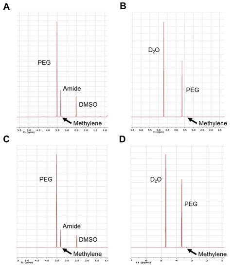 To characterize the core-shell structure of the micelles, mPEG-zein conjugates (5 mg/mL in deuterium oxide (D2O) and deuterated dimethyl sulfoxide (DMSO-d6)) were analyzed by Proton Nuclear Magnetic Resonance (1H NMR). 1H NMR spectra were recorded at 500 MHz using a Bruker Avance® III HD500 NMR spectrometer (Billerica, MA, USA), and the core-shell structure was confirmed by comparing the spectra in DMSO-d6 and D2O.