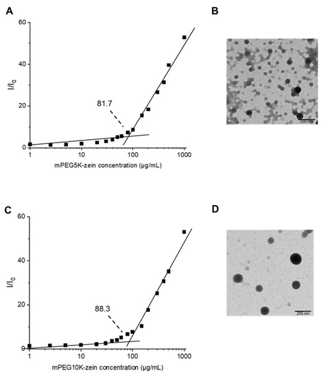 The assembly behavior of mPEG-zein was further studied by a steady-state fluorescence technique using Nile red as a hydrophobic fluorescent probe. Nile red is weakly fluorescent in water. However, its fluorescence intensity increased with increasing mPEG-zein concentrations, as Nile red was solubilized within the hydrophobic core of the micelles [29]. The CMC values decreased by reducing the MW of conjugated PEG (81.7 µg/mL for PEG5K versus 88.3 µg/mL for PEG10K) (Figure 2A,C). This could be explained by the overall higher hydrophobic content of the smaller PEG conjugate over the larger PEG conjugate, as the micelle formation occurs mainly through the hydrophobic interactions among zein molecules. The CMC value obtained for mPEG5K-zein micelles was relatively higher than that previously published (55 µg/mL and 20 µg/mL in Podaralla et al. [19] and Song et al. [20], respectively), when using pyrene as a fluorescence probe. This difference might be due to the different hydrophobic probes used, as well as the type of zein used as starting material. Podaralla et al. used white zein, and Song et al. used purified α-zein, while yellow zein was chosen in our study [19,20]. Chan et al. previously demonstrated that the CMC value for diblock copolymer micelles characterized using pyrene was lower than that using Nile red (15.1 mg/mL by pyrene versus 19.5 mg/mL by Nile red) [30]. Nevertheless, the CMC values obtained in our study were low, indicating high stability of the mPEG-zein micelles.