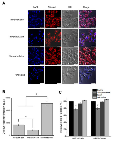 The cellular uptake of mPEG-zein micelles was further confirmed by flow cytometry (Figure 3B and Figure S2). The mean fluorescence intensity (MFI) of cells incubated with Nile red solution (12,796 ± 712 arbitrary units (a.u.)) was at least three-fold higher than that of mPEG-zein micelles, which correlated well with the observation from confocal microscopy. This could be explained by the different cellular uptake mechanisms used by Nile red solution and the micelles: passive diffusion of the Nile red solution to the cells, while the micelles are taken up by endocytosis. Furthermore, mPEG5K-zein micelles were more efficacious in delivering Nile red into the cells, by approximately two-fold in comparison with its longer chain counterparts (MFI of 4256 ± 195 a.u. for mPEG5K-zein versus MFI of 2169 ± 85 a.u. for mPEG10K-zein), therefore demonstrating that PEGylation with a shorter PEG chain length could improve the cellular uptake efficacy of the zein micelles. Higher uptake with a shorter PEG chain length was consistent with several types of PEGylated nanocarriers [34,36,37]. Increasing PEG MW was shown to prevent nanoparticle-cell interactions, as higher MW PEG grafting led to a larger surface shielding of the micelles [38,39]. Hence, a relatively lower uptake of the mPEG10K formulation compared to the mPEG5K-based one in cancer cells could be explained by a decrease in cell adhesion.