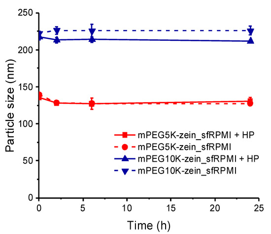 When the micelles were allowed to interact with HP, such an increase in size was not observed (Figure 4). The size of mPEG5K-zein micelles stayed the same over 24 h, independent of the presence or absence of HP (from 135.4 ± 1.4 nm to 130.9 ± 4.5 nm after 24 h). Likewise, mPEG10K-zein micelles displayed a similar size over 24 h. The presence of HP led to a slight decrease of the micelle size (212.1 ± 0.9 nm and 225.9 ± 6.0 nm, respectively with and without HP after 24-h incubation). In general, proteins interact with nanoparticles by forming a corona around their surface, resulting in a thickening of the nanoparticle surface and a subsequent increase in their size [42,43,44,45]. However, they may lead to a size reduction due to osmotically driven shrinkage [46]. For our delivery systems, the latter effect may be predominant, particularly for the mPEG10K formulation. Repulsive forces of mPEG10K-zein micelles against HP could prevent the formation of a dense protein corona. Instead, proteins that are impermeable to the micelles might induce osmotic pressure, which caused water to escape from the micelle and the micelle to shrink.