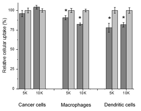 Cellular uptake of Nile red loaded in mPEG5K-zein (“5K”) and mPEG10K-zein (“10K”) micelles precoated with HP (gray) or glucose 5% (w/v) solution as control (light gray), by B16-F10-luc-G5 cancer cells, macrophages, and dendritic cells (n = 6) (*: p < 0.05, compared with controls without protein corona).
