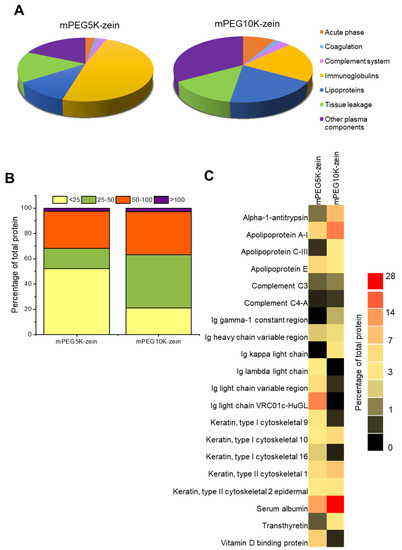 Proteomic analysis of the protein corona surrounding mPEG5K-zein and mPEG10K-zein micelles. Proteins were classified by function (A) and weight (kDa) (B). The 20 most abundant proteins in the corona of mPEG-zein micelles were used to create the heat map (C).
