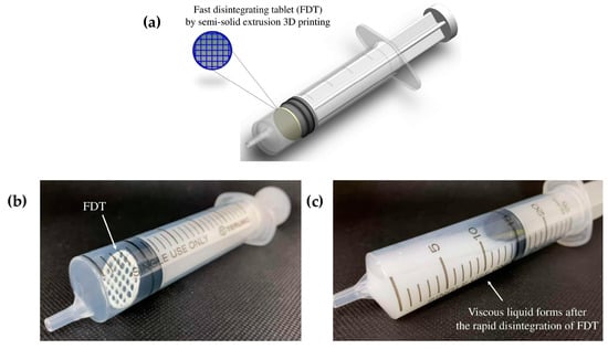 Graphical illustration of the ‘tablet-in-syringe’ device (a) and images of 3D-printed fast-disintegrating tablet (FDT) pre-filled in a dosing syringe (b), and after disintegration (c).