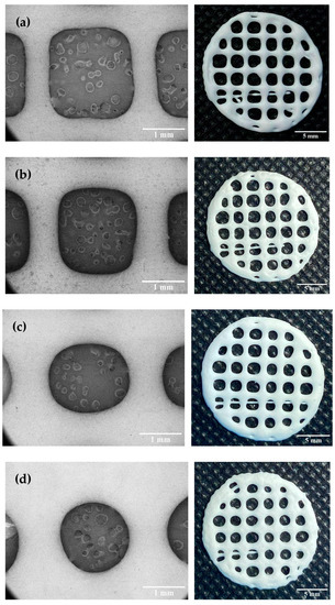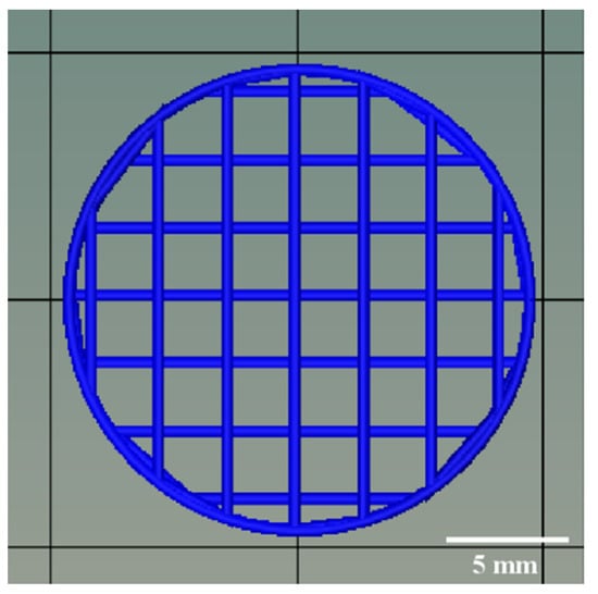 The model of 3D-printed FDTs in cylindrical shape was predesigned and created using the computer-aided design (CAD) software and then exported in the stereolithography (STL) file format. As shown in Figure 2, the diameter and thickness of the 3D model were designed to be 19.0 mm and 1.0 mm, respectively. In addition, based on preliminary optimization results (data not shown), the 3D-printed FDTs were designed to have a porous grid structure with a 25% infill density and a layer height of 0.41 mm, which is equivalent to the inner diameter of a 22G nozzle. Subsequently, the printing inks were transferred into a 3 mL syringe (Terumo, Tokyo, Japan) and printed with an SSE 3D printer (BIOX 3D printer, Cellink, Boston, MA, USA). The stepper motors drive the motion in the Z direction via twin lead screws with an overall resolution of 0.001 mm/step with a 1.8° step angle. During the printing process, the nozzle speed was kept at 10 mm/s. The extrusion rate was varied to 3.0, 3.5, and 4.0 μL/s, which corresponded to an estimated printing time of 0.8–1.2 min per tablet, to investigate its effect on the dimensional and pore geometry accuracy of the 3D-printed FDTs. After printing, the 3D-printed FDTs were dried at room temperature for 24 h to remove solvents.