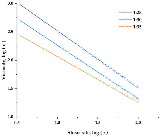 Log–log plot fitting with power-law model of viscosity as a function of shear rate of the printing inks at polymer:drug ratios (w/w) of 1:25, 1:30, and 1:35.