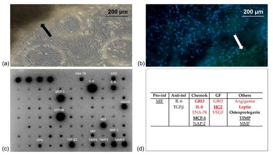 Lipoaspirate clusters, indicated with an arrow in the microscopic images, cultured in basal medium: (a) phase-contrast microscopy of cell outgrowth in a 3D collagen matrix; (b) fluorescence microscopy of DAPI stained cells outgrown from lipoaspirate cluster; (c) protein detected in supernatants, classified in (d) according to their activity. Underlined are those with known activity in wound healing, in bold those with antimicrobial activity, in red those with angiogenic activity.