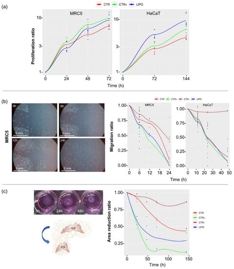In Figure 2, the results of proliferation (Figure 2a), migration (Figure 2b), and contraction (Figure 2c) of cells are reported. Proliferation test data are expressed as proliferation ratio with respect to time 0. ATP quantification showed an almost double increase in proliferation of keratinocytes (HaCaT) treated with LipoCM (LIPO) compared to control keratinocytes (CTR) both at 72 h and at 144 h (p < 0.01). Moreover, the LipoCM showed higher proliferative activity compared to keratinocytes treated with FGF2 used as known positive proliferative stimulus (CTR+) []. Fibroblasts (MRC5) also increased in their proliferation when treated with LipoCM (LIPO) compared to the basal proliferation control (CTR).