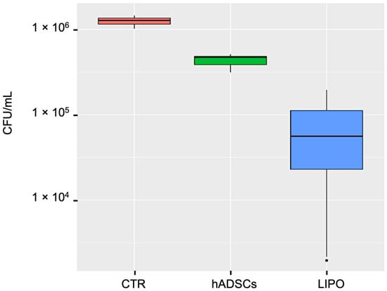 Lipoaspirate and hADSCs antibacterial activity against E. coli. Bacterial growth was assessed by the viable cell counting method and expressed as CFU/mL. CTR = positive control of E. coli growth: basal media inoculated with 300 CFU of E. coli; LIPO = lipoaspirate in basal media inoculated with 300 CFU of E. coli; hADSCs = lipoaspirate derived hADSCs in basal media inoculated with 300 CFU of E. coli.