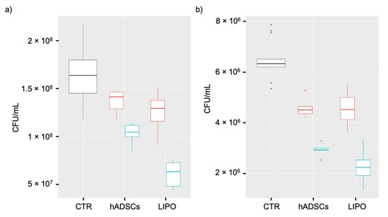 Concerning the antibacterial activity, we first demonstrated a direct effect of both lipoaspirate and lipoaspirate-derived hADSCs against E. coli cells co-incubated for 6 h. The activity of hADSCs against bacterial pathogens is well known; Krasnodembskaya et al. [] proved that human bone marrow-derived MSCs were able to inhibit E. coli growth directly, after 6 h co-incubation. In addition, they demonstrated that their conditioned media were significantly active against E. coli and P. aeruginosa, with growth inhibition percentages of 40% and 70%, respectively, and the antimicrobial activity was ascribed to the secretion of the antimicrobial peptide, human cathelicidin hCAP-18/LL-37.