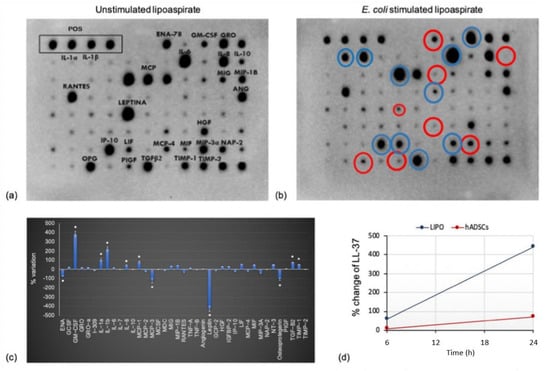 Cytokine release of unstimulated lipoaspirate (a) and cytokine release of E. coli stimulated lipoaspirate (b) after 24 h coincubation. Blue: cytokines with increased level, red: cytokines with lowered levels. Semiquantitative analysis expressed as % variation of cytokines profile after E. coli stimulation (c). Change of LL-37 amount in lipoaspirate culture medium (LIPO) and hADSCs culture medium (hADSCs) after 6 h and 24 h of co-culture with 300 CFU/mL of E. coli compared with unstimulated samples (d).