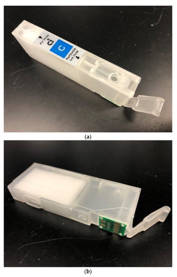 Inkjet printing has become common technology and a large number of consumer-grade inkjet printers are commercially available. This technology relies on the precise control and deposition of fine ink droplets onto a thin-film substrate, such as paper or plastic polymeric sheets. In many systems, these ink droplets are controlled via a fixed printhead, which typically consists of thousands of tiny nozzles for the rapid printing of various color inks using piezoelectric or thermal technologies. This process has been used for a wide variety of emerging applications, including organic and inorganic thin-film deposition, electronics, and devices, among others [,]. Although these shear and temperature conditions are relatively high, the impact on the liquid is relatively minor due to its transient nature and previous reports have shown that mammalian cells have survived this process intact []. A separate cartridge acts as a reservoir for the ink liquid and is typically mounted above the printhead. In recent years, a plethora of third-party refillable ink cartridges have become commonly available. These ink cartridges are compatible with many consumer-grade inkjet printers and allow the user to load them with generic inks or, in this case, other liquids of interest.