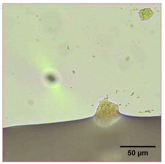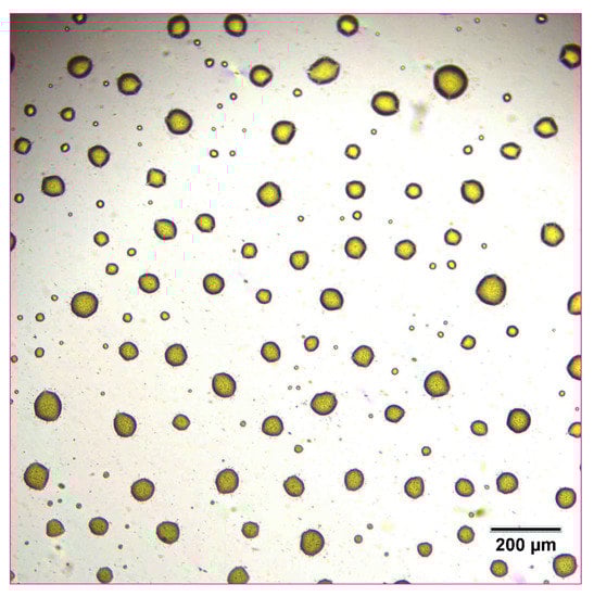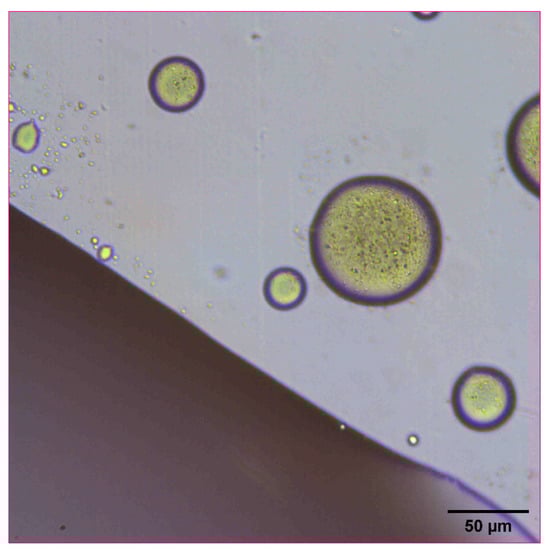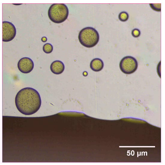 The reconstitution and dissolution of the printed nanosuspensions after drying were then investigated. A drop of water was placed onto the transparency. The wetting and redispersion of the nanosuspension droplets were observed in real-time by monitoring the advancing water line with optical microscopy (Figure 6, Figure 7 and Figure 8). Upon exposure to water, the dried nanosuspension droplets were immediately hydrated, releasing the drug nanoparticles into solution. The resulting reconstituted nanosuspension was recovered and analyzed by optical microscopy, showing a homogeneous, well-dispersed suspension with no significant aggregation (Figure 9). DLS analysis of the reconstituted sample showed particles consisting of 114 nm in diameter, showing no significant aggregation after drying and redispersion, confirming that the stability of the nanosuspension during this process was maintained.