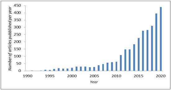 The goal of researchers has been to replace normal teeth function and prevent the peri-implantitis issues using dental implants made of novel materials that trigger the osseointegration processes. Figure 2 shows a clear increase implant research [2] from the Web of Science database. Data were obtained using filters with the keyword “peri-implantitis”, refined by review articles with the timespan 1990–2020.
