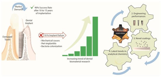 This review includes a brief historical overview followed by 1-engineering strategies in dental implants; 2-coatings; 3-trends in analytical chemistry to cope with both osseointegration with the host bone tissue, and peri-implantitis issues. A graphical overview is presented in Figure 3.