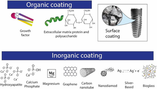 The biocompatibility, osseointegration and therapeutic/antibacterial effect of the implant coating have been considered to be the most important factors for the long-term durability of dental implants. Various bioactive materials and local drug delivery techniques have been explored. These novel coatings have been divided into two groups, depending on the nature of the material applied (Figure 5), i.e., organic and inorganic coatings.