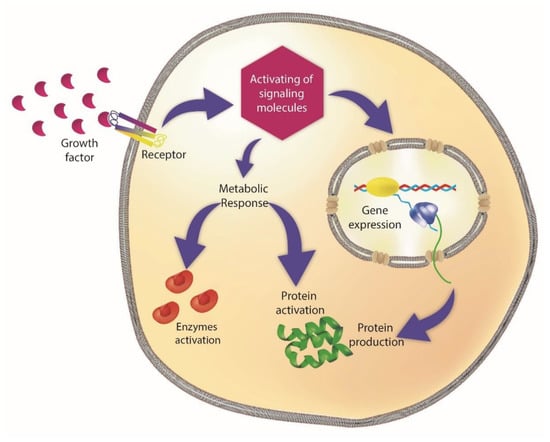 Growth factors are a group of molecules involved in the cell division and tissue proliferation. Each growth factor recognizes a specific membrane receptor and their union initiates or inhibits cell division (Figure 8). Main growth factors used in implant coatings are bone morphogenetic proteins (BMPs) and vascular endothelial growth factor (VEGF).