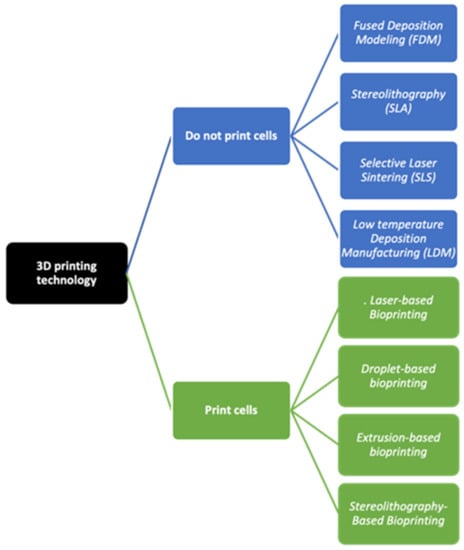 The 3D printing technology allows the manufacturing of custom-made 3D structures with high resolution and controlled internal micro-architecture. There are different 3D printing techniques that could be used to produce scaffolds for tissue regeneration, each one with advantages and drawbacks. The 3D bioprinting is a manufacturing technique that could be used to produce artificial scaffolds or tissue constructs using a layer-by-layer deposition process. In association with tissue engineering applications, the 3D bioprinting techniques could be divided into two major groups: the ones that could not print living cells directly into the structure and the ones that can. Among the first ones, it is possible to find fused deposition modelling (FDM), stereolithography (SLA), selective laser sintering (SLS) and low-temperature deposition manufacturing (LDM). On the other hand, there are cellular bioprinting techniques that uses bioinks with viable cells in order to form the construct. These bioprinting techniques could be classified into four categories: laser-based, droplet-based, extrusion-based, and stereolithography-based bioprinting [20,21] (Figure 1).