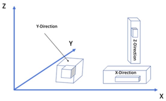 - Build orientation: the way in which the component could be adjusted into the building platform using the three axes: X, Y, and Z of the FDM machine (Figure 3).