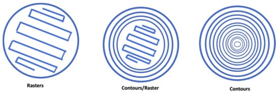 - Infill style: allows determination of the internal pattern of the structure, which could be raster, contour, or contour–raster. The most frequently used is the raster fill style, produced by the nozzle movement back and forth to fill the delimited area. On the other hand, to produce contour style, the tip movements are as a closed-loop. Finally, the combination of both previous approaches allows one to get the contour–raster style (Figure 4).